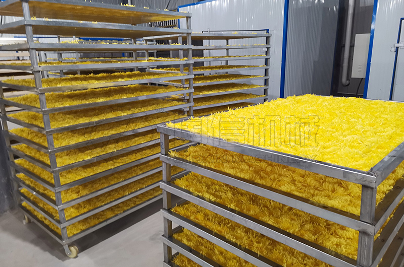 導讀:鮮菊花含水率我們按80%,要烘干到含水率13%,通過公式:干花重量=濕花重量×(1-烘干前含水率)/(1-烘干后含水率)可以計算出一百斤藥用菊花烘干后剩23斤左右,而鮮菊花4.35斤烘干后為一斤干菊花。