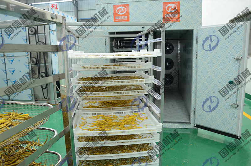 國信廠家推出的新型黃花菜殺青烘干一體機主要有兩種:一種是可以實現(xiàn)全自動化殺青烘干加工的大產量流水線設備,另一種是中小產量的空氣能熱泵殺青烘干房設備。