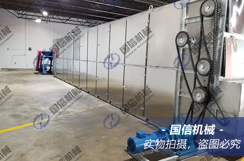①佛手片通過上料輸送機進入烘干機主機,通過勻料裝置將佛手片均勻鋪在網帶上。