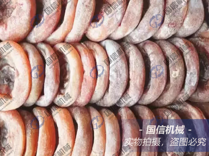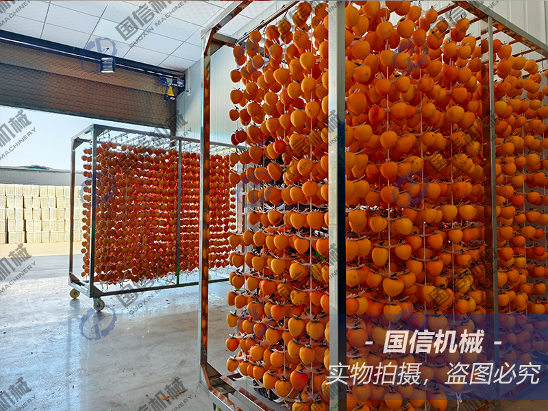 烘干一道工序:柿果進入烘室后,迅速提升溫度至40℃~50℃,使柿果中的乙醇脫氯酶活性處于高狀態(tài),以使柿果內(nèi)呼吸速度提高,快速完成軟化、去澀和部分脫水(約25%),持續(xù)烘干時間視柿果大小和成熟程度而定,約12小時左右。烘干柿子時,防霉很重要。稍有不慎,就會導(dǎo)致整個烤房的柿子在幾個小時內(nèi)發(fā)霉腐爛。因此,烘烤中的相對濕度要保持在70%以下,這樣可以有效地預(yù)防發(fā)霉。