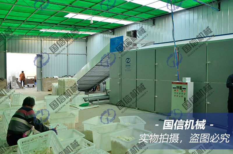 二、烘干的方式 山藥烘干使用的是流水線網(wǎng)帶式烘干,烘干方式是動(dòng)態(tài)烘干,通過網(wǎng)帶式烘干機(jī)的幾層不銹鋼網(wǎng)帶不停翻轉(zhuǎn),實(shí)現(xiàn)對(duì)山藥的烘干。熱源一般使用的是燃燒型或者空氣能熱泵,熱量從底部進(jìn)入烘干機(jī)內(nèi)對(duì)山藥進(jìn)行烘干,烘干過程中排出的水分從機(jī)器頂部的排濕口排出。我們?cè)诤娓缮剿帟r(shí),主要選擇的設(shè)備就是網(wǎng)帶式烘干機(jī),選擇這種設(shè)備的好處是:一、網(wǎng)帶烘干機(jī)的產(chǎn)量比較大,每天的處理量可以從2噸到50噸不等。二、烘干時(shí)間短,因?yàn)榫W(wǎng)帶烘干機(jī)是動(dòng)態(tài)烘干,山藥在設(shè)備中不停翻轉(zhuǎn),所以受熱速度比較快,加熱比較均勻,烘干時(shí)間可以縮短幾個(gè)小時(shí)。