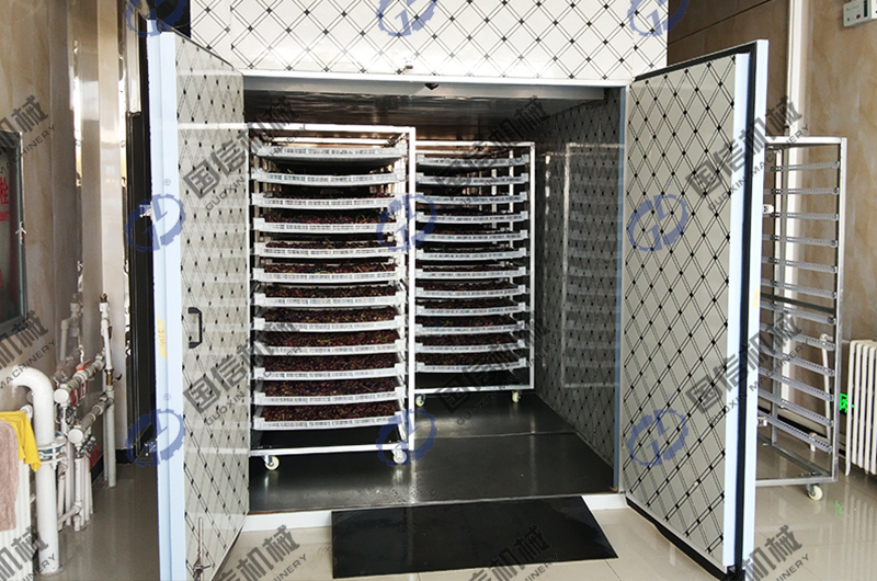 五、烘干的過程如下:將桃膠放入物料車托盤,每盤15斤,每車12層,單臺車共180斤,6P主機帶5.8米長3米寬2.2米高烘干房一次可以放入8臺物料車,共放入桃膠1500斤,烘干過程需要12-15小時,溫度控制在55度,連續除濕即可完成。