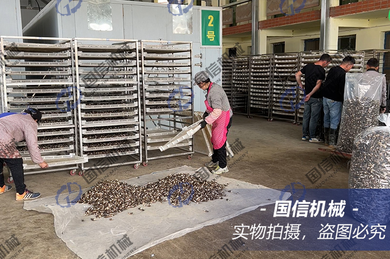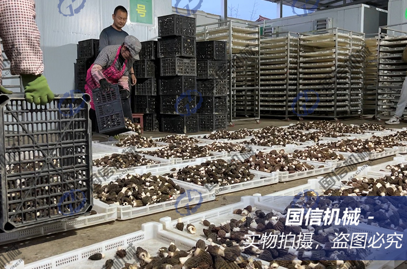 羊肚菌水分含量非常高,在烘干過中要特別注重溫度與濕度的控制。而且不同批次采收的羊肚菌其水分含量不一樣。一般來說,第一茬菇的含水量相對低,陸續第二茬菇、第三茬菇的含水量一批批加大,都可以在第一茬菇烘干經驗的基礎上適當加長時間。這里以第一茬菇的烘干為例,介紹羊肚菌的烘干經驗: